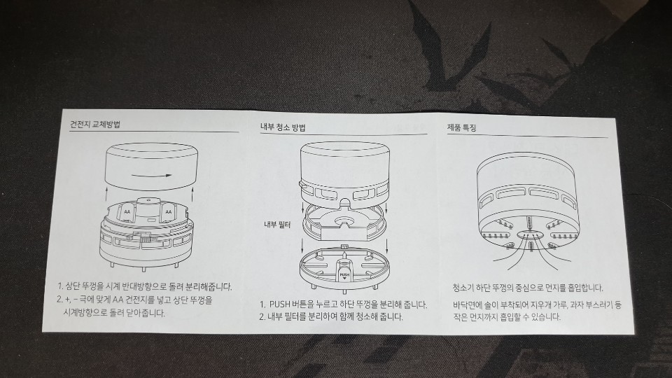 밑면에 청소기처럼 먼지나 이물질들을 빨아들입니다.