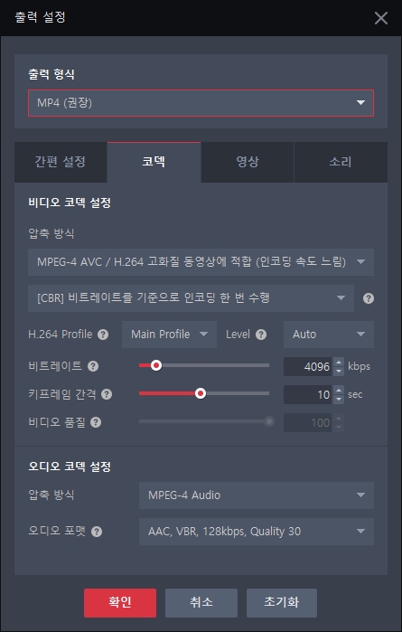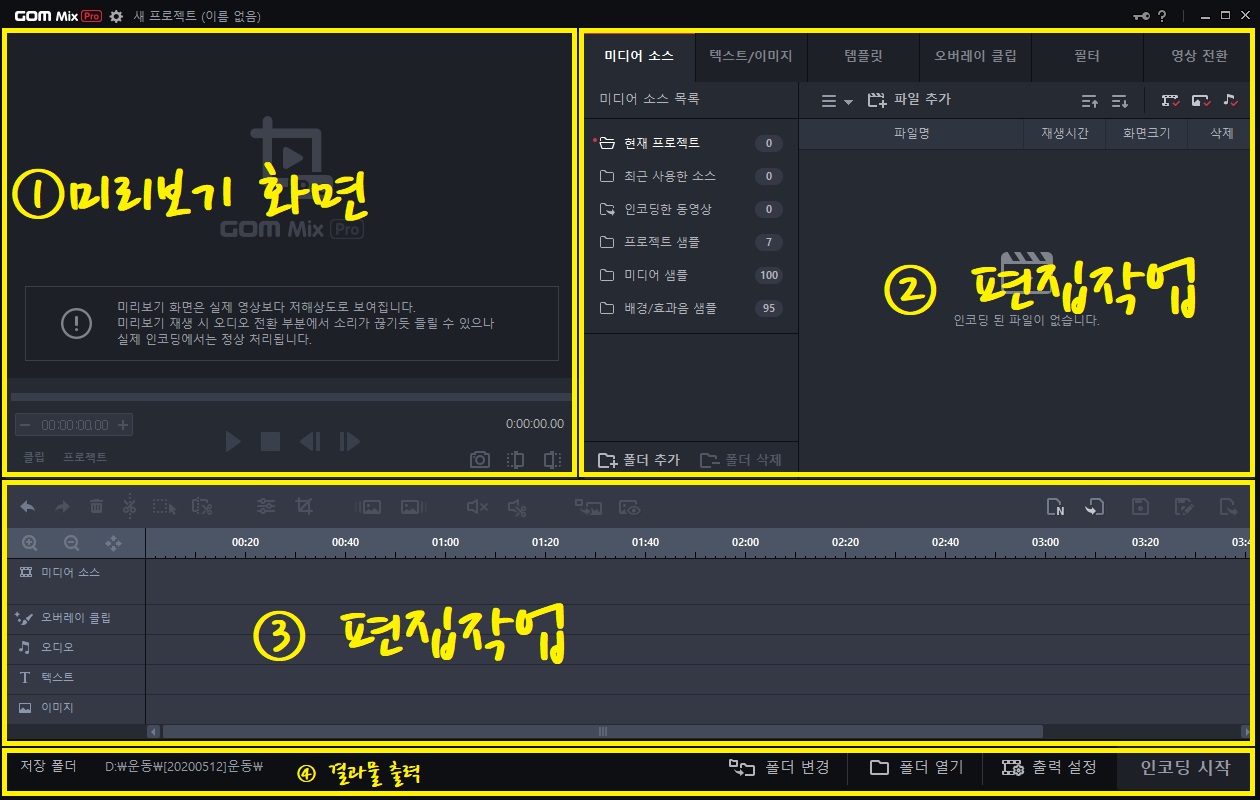 ④ 결과물 출력부분에는 출력 설정 및 인코딩을 통해서 결과물을 얻을 수 있는 공간입니다.