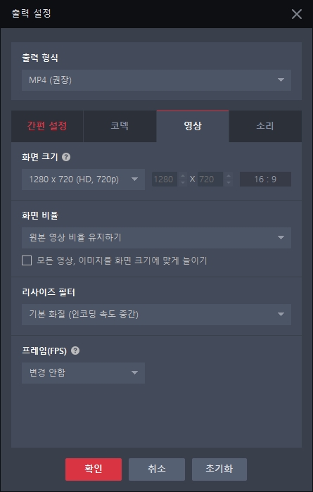 영상 탭에서 본인이 촬영한 화질에 맞게 설정해야 원본 화질로 이용할 수 있습니다. 예를 들어서 FHD 화질로 촬영했는데 HD화질로 선택하는 경우 화질 저하가 일어납니다. 단, 4K 화질은 지원되지 않으므로 FHD까지 되는 거 같네요.