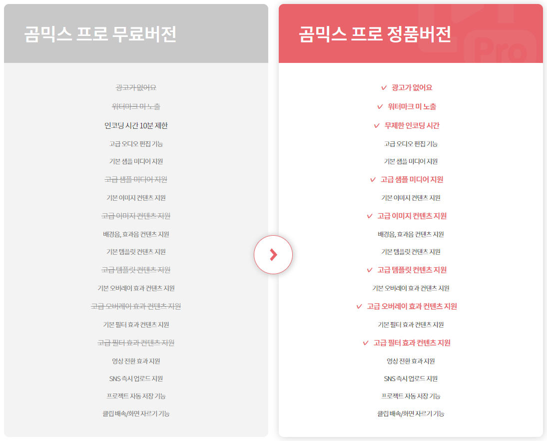 이 편집 프로그램은 유, 무료로 구성되어있습니다. 비교를 하자면 간단하게 하단 이미지를 참고하시면 되겠습니다.